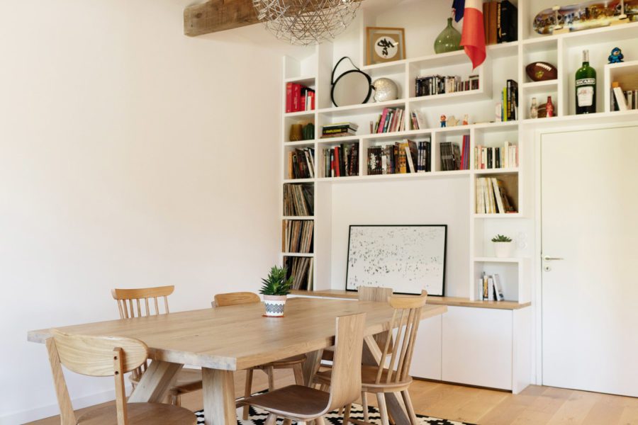 Bibliothèque sur-mesure en MDF laqué blanc et plateau chêne