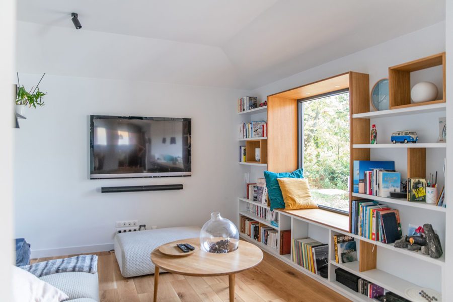 Dans cette maison, Brotherwood a réalisé une bibliothèque sur mesure qui s’articule autour d’une large fenêtre, transformée en véritable point central de la pièce. L’aménagement intègre un bow-window, pensé comme un coin lecture confortable, où la lumière naturelle devient complice du mobilier. Le projet associe la chaleur du chêne à la sobriété du MDF laqué blanc, une combinaison qui équilibre raffinement et clarté. Tout autour de la fenêtre, des rangements ouverts se déploient en rythme, créant une structure légère et harmonieuse. Les lignes droites et régulières guident le regard vers l’extérieur, où le paysage s’invite comme une extension naturelle de la composition intérieure. Plus qu’un simple espace de rangement, cette bibliothèque propose une expérience de vie : lire, contempler, profiter d’un moment de calme au cœur de la maison. Chaque détail, depuis l’assemblage précis des matériaux jusqu’à l’intégration discrète des volumes, illustre le savoir-faire de Brotherwood, capable de transformer une idée en un agencement élégant et pérenne.