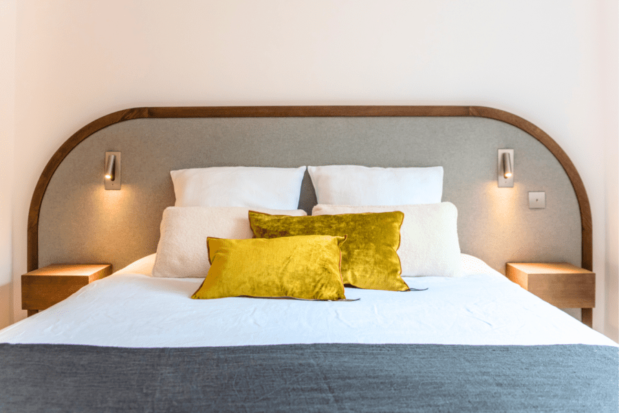 Tête de lit en chêne huilé teinté et tissu avec 2 chevets