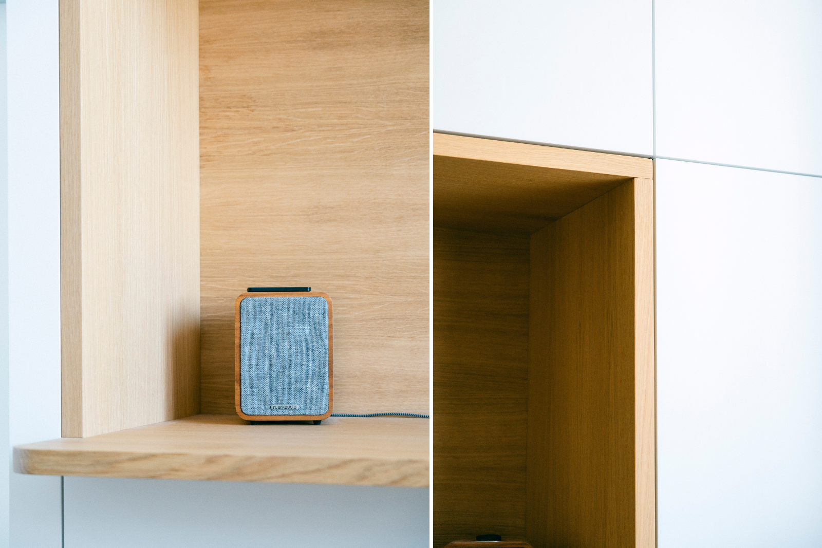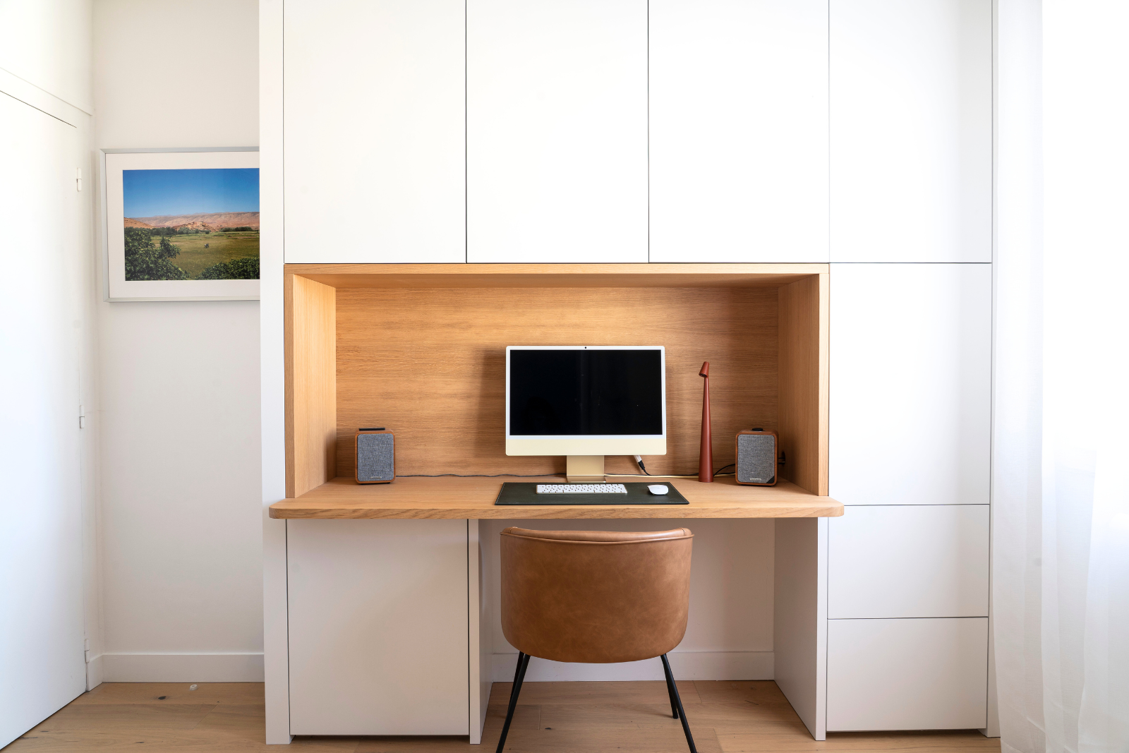 Les volumes organisent l’espace et offrent une capacité de rangement optimisée : compartiments dédiés aux dossiers, intégration de l’imprimante, rangements fermés généreux. La niche en chêne introduit une respiration visuelle et matérialise l’espace de travail, créant un contraste chaleureux avec les façades laquées.