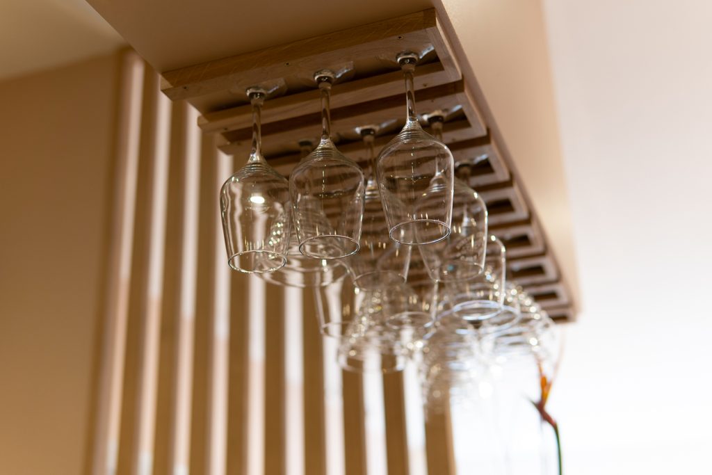 Rangement verres, étagères et claustras en chêne