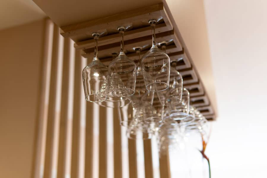 Rangement verres, étagères et claustras en chêne