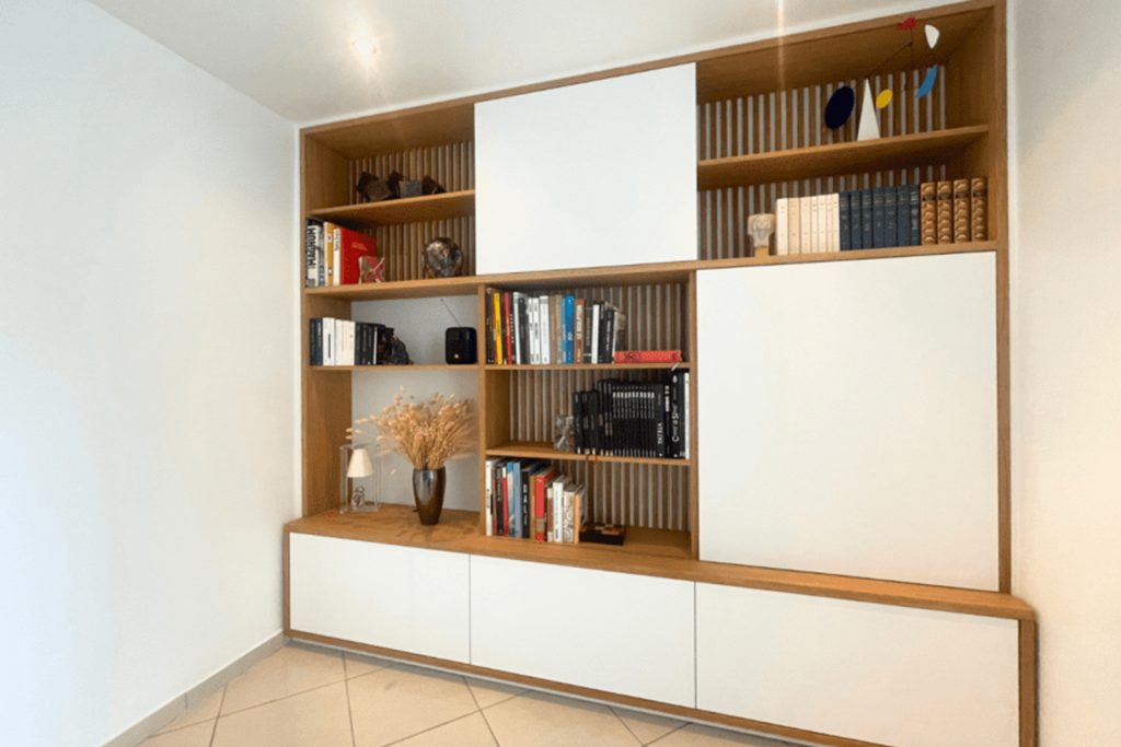 Dans un appartement de Bayonne, Brotherwood a réalisé une bibliothèque sur mesure qui allie pureté des lignes et chaleur des matériaux. L’ensemble combine le chêne, choisi pour son élégance intemporelle, et un MDF laqué blanc dont la sobriété met en valeur la clarté de l’espace. La bibliothèque se structure en deux parties distinctes : une base fermée par des tiroirs, pensée pour accueillir documents et objets du quotidien, et une partie haute composée de niches ouvertes. Certaines d’entre elles se distinguent par un fond en claire-voie de chêne, apportant un jeu de rythme et de texture qui dynamise l’ensemble. Deux portes coulissantes viennent compléter l’agencement, offrant la possibilité d’alterner entre dissimulation et mise en valeur selon les besoins. À travers cette réalisation, Brotherwood illustre son savoir-faire dans la fabrication de mobiliers sur mesure, capables de conjuguer esthétique et fonctionnalité. Cette bibliothèque ne se limite pas à un espace de rangement : elle s’impose comme une pièce maîtresse de l’appartement, structurante et élégante.
