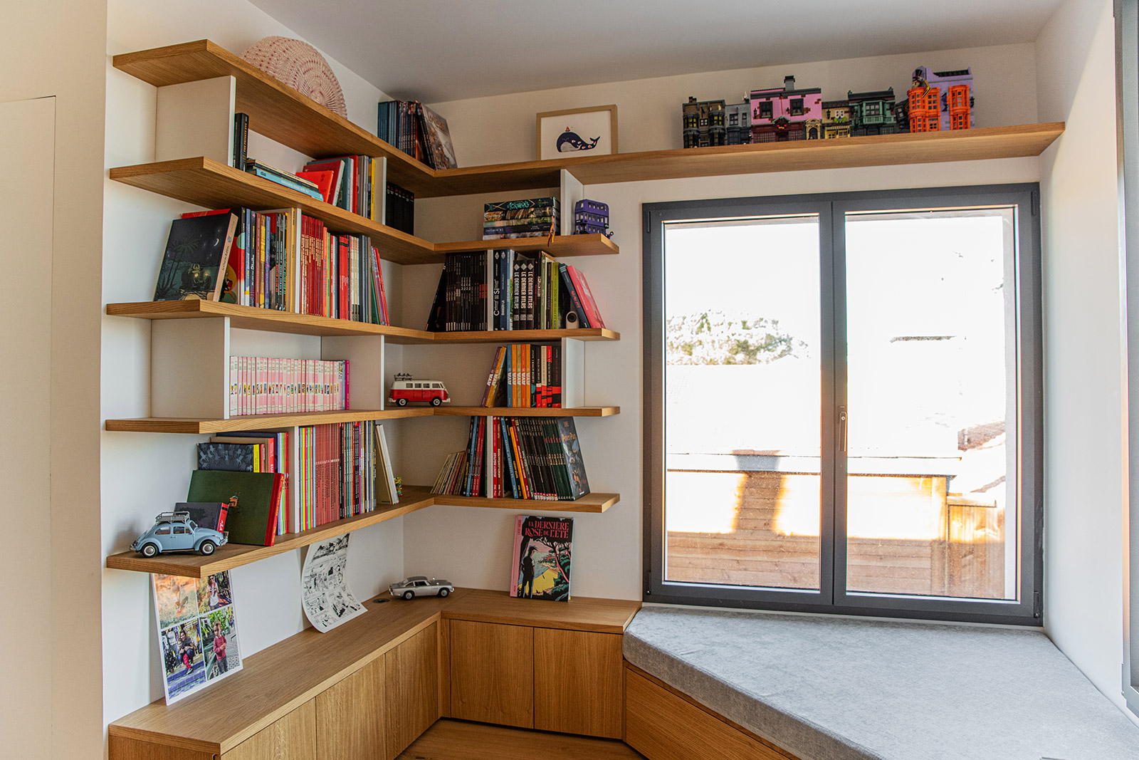 Brotherwood a réalisé une bibliothèque sur mesure en chêne, pensée pour créer un espace à la fois fonctionnel et accueillant. Le mobilier intègre un coin lecture aménagé sur une banquette d’angle, offrant un lieu confortable pour profiter des ouvrages dans une ambiance chaleureuse et intimiste. La partie basse de la bibliothèque est composée de rangements fermés, conçus pour organiser le quotidien et dissimuler ce qui doit l’être, tandis que la partie haute se déploie en étagères ouvertes, permettant de mettre en valeur les livres et objets décoratifs. L’agencement exploite pleinement l’angle de la pièce, structurant l’espace avec équilibre et fluidité. Le choix du chêne, avec ses teintes naturelles et sa texture chaleureuse, confère à la bibliothèque une présence élégante et intemporelle. Chaque détail, depuis les finitions soignées jusqu’à la conception de la banquette, témoigne du savoir-faire artisanal de Brotherwood et de sa capacité à transformer un simple rangement en un élément d’architecture intérieure, où confort, fonctionnalité et esthétique se rencontrent.