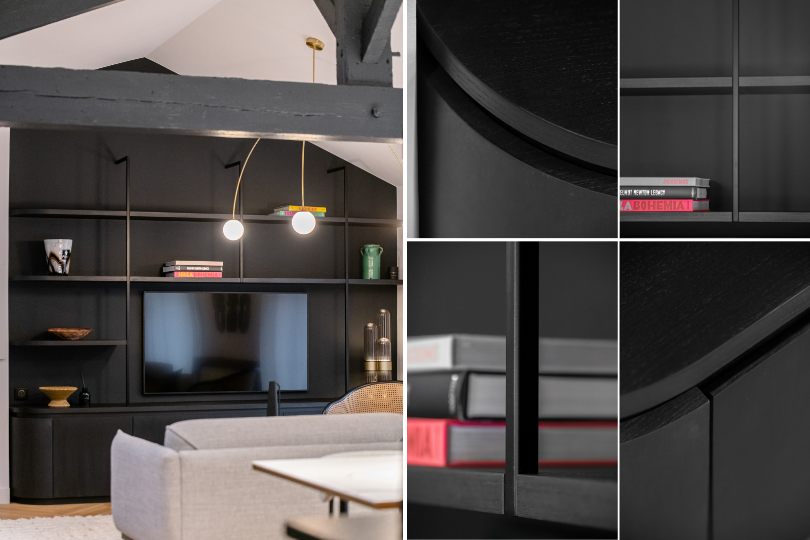 bibliothèque meuble TV qui allie sobriété et modernité. La partie basse se distingue par un angle arrondi en chêne huilé noir, évoquant l’effet du bois brûlé, qui apporte une touche