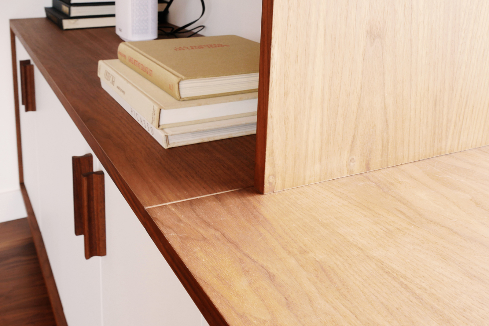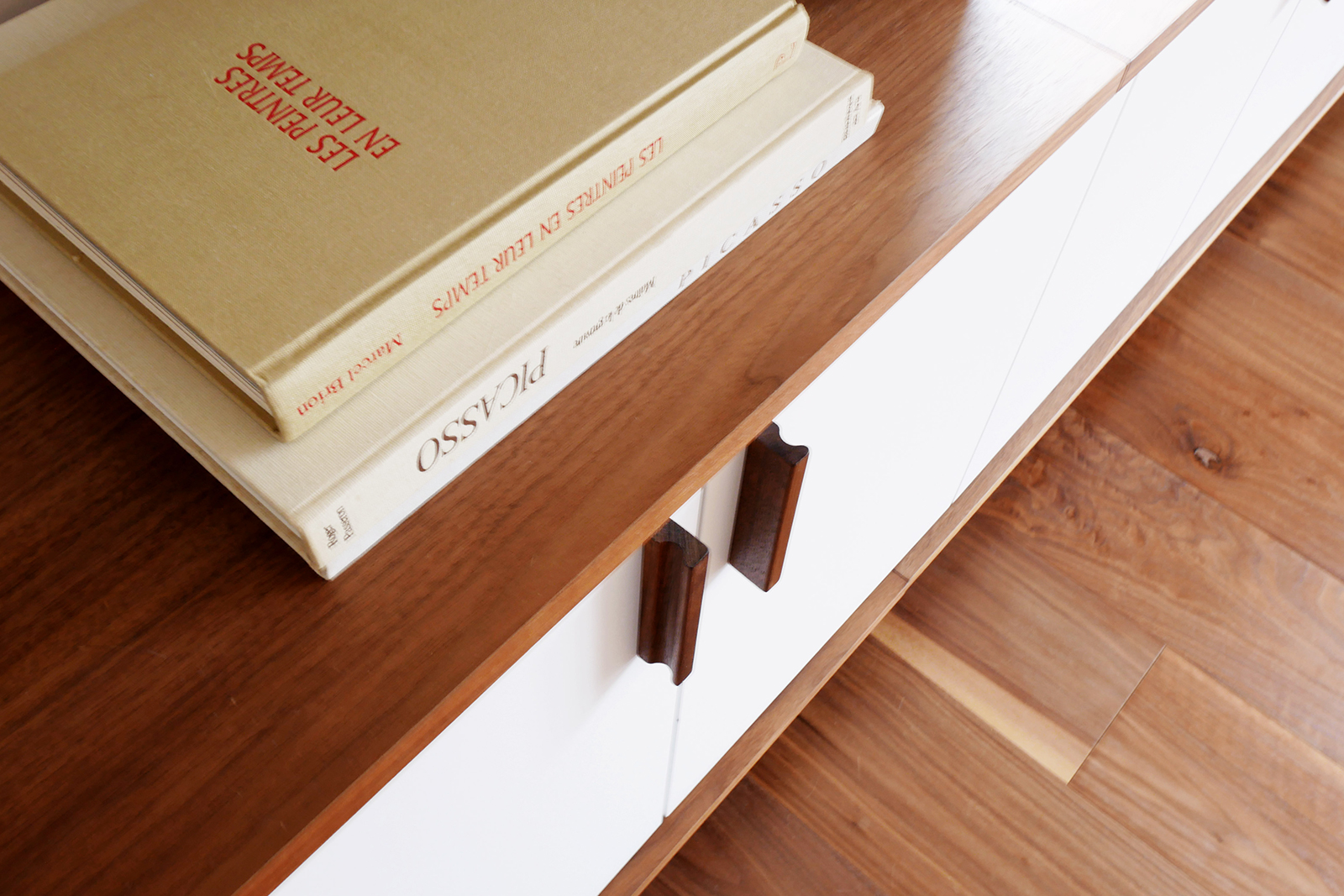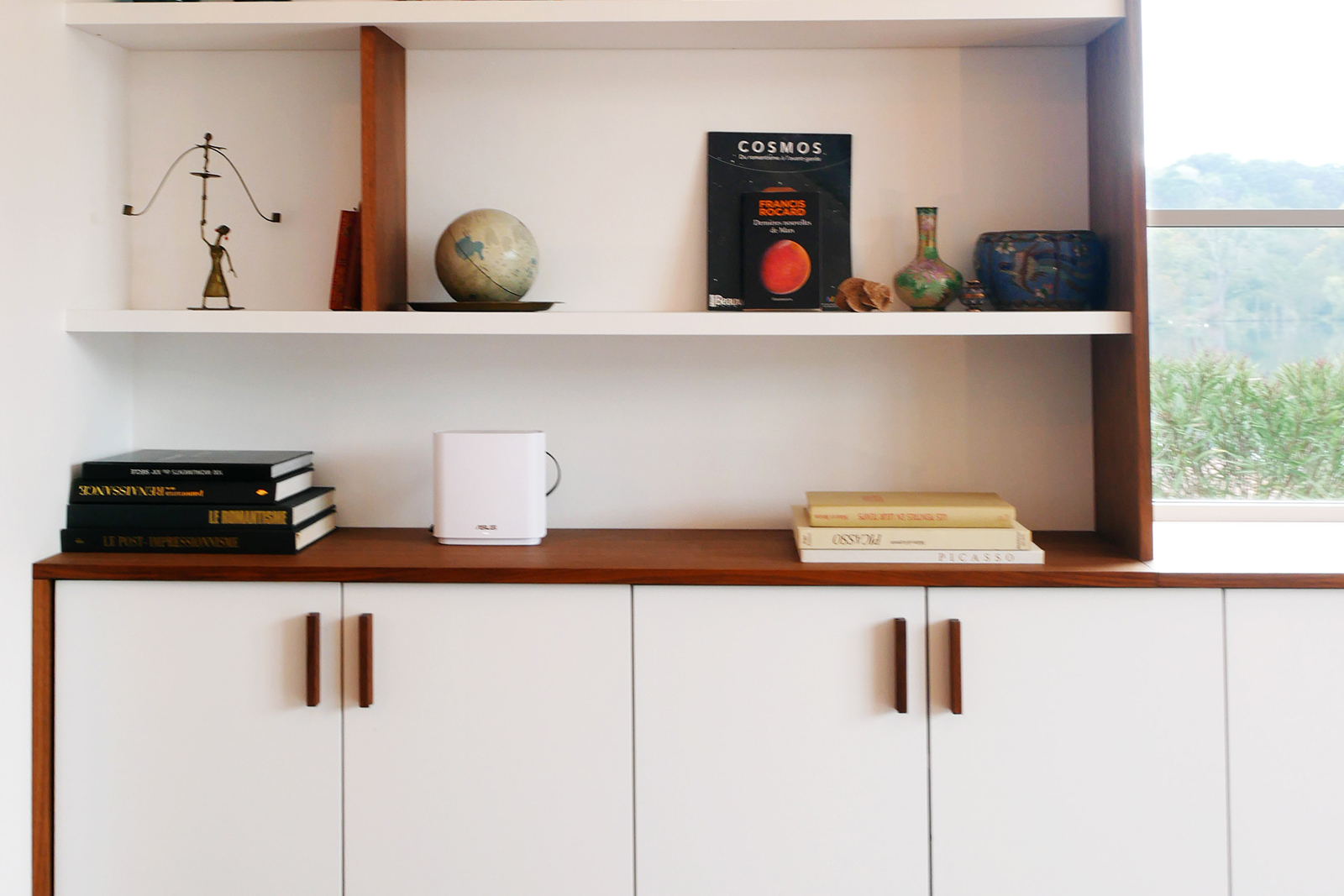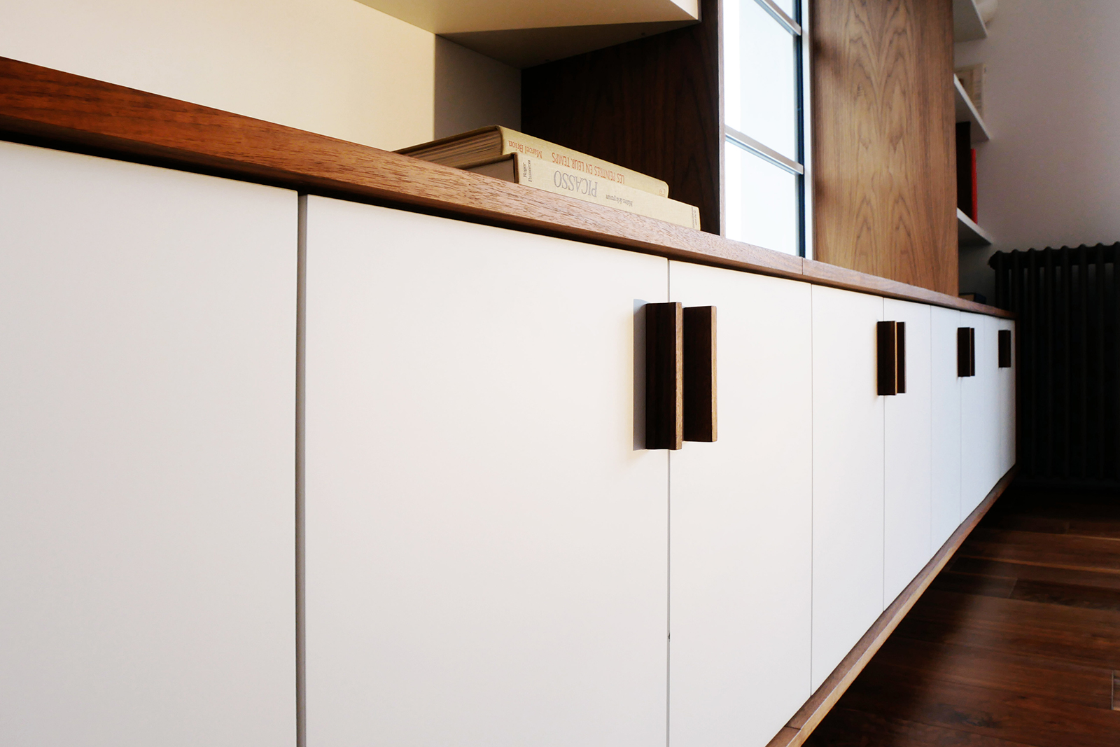 Dans une maison ouverte sur un paysage de lac et de forêt, Brotherwood a fabriqué une bibliothèque sur mesure pensée pour dialoguer avec la lumière et la vue. L’association du noyer et du MDF laqué blanc crée un contraste harmonieux entre la profondeur du bois et la clarté de la laque, soulignant l’élégance de l’ensemble sans alourdir l’espace. La partie basse, composée de portes battantes, assure une capacité de rangement discrète et fonctionnelle. Au-dessus, des étagères ouvertes se déploient autour d’une large fenêtre, encadrant la perspective et transformant la vue extérieure en véritable tableau naturel. Cette intégration subtile confère à la bibliothèque un rôle à la fois pratique et contemplatif, où chaque objet exposé trouve sa place en résonance avec l’environnement extérieur. Par le soin porté aux proportions et aux détails, cette réalisation illustre le savoir-faire de Brotherwood dans l’art d’adapter un mobilier à son contexte. Ici, l’agencement dépasse la simple fonction de rangement pour devenir un élément d’architecture intérieure, en lien direct avec la beauté du paysage.