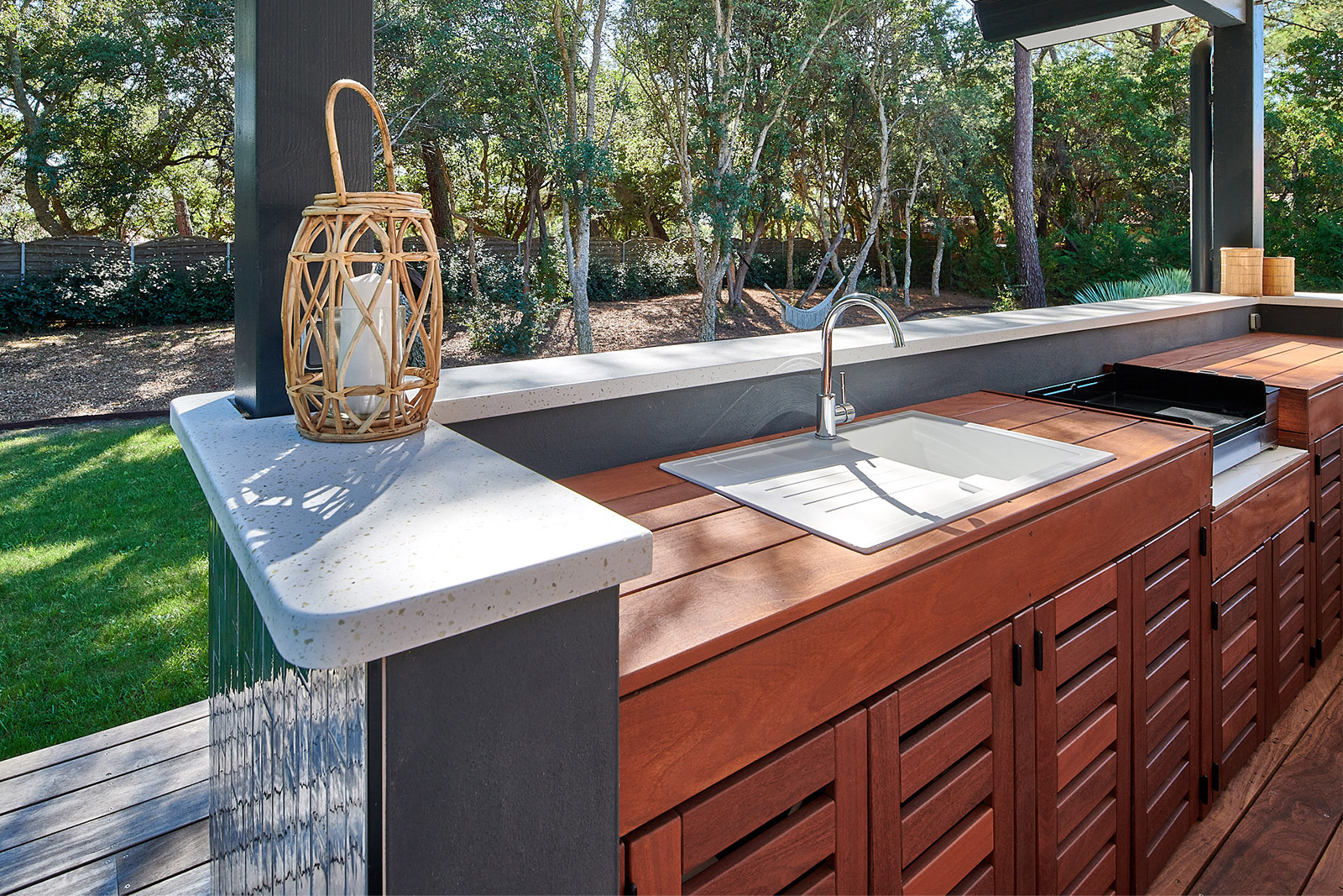 Agencement d’une cuisine extérieure en bois exotique et comptoir en résine terrazzo
