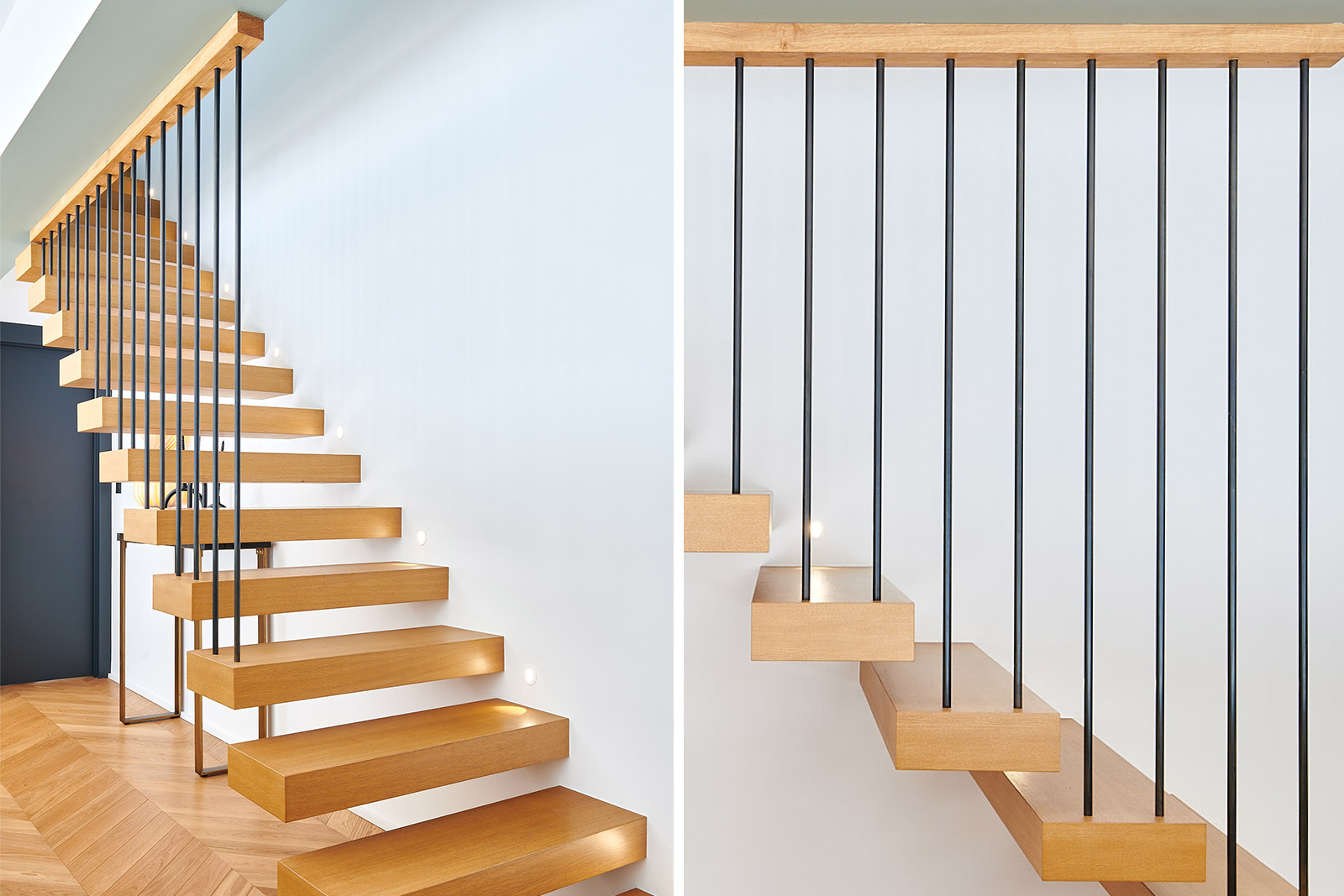 Garde-corps en tubes métalliques fixés sur accroche en chêne