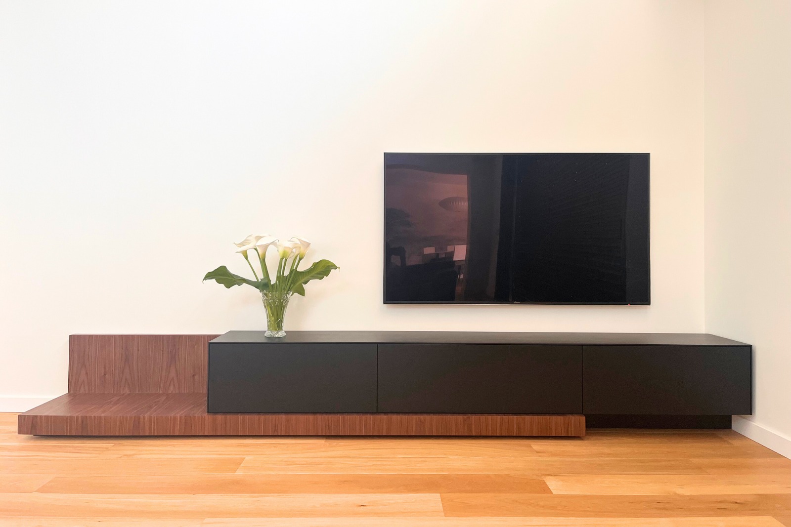 Dans une maison à Arcangues, Brotherwood a fabriqué un meuble TV sur mesure au design résolument contemporain, mêlant la chaleur du noyer et la sobriété du MDF laqué noir. L’ensemble, pensé comme un jeu d’équilibres, se compose de deux volumes superposés, dont l’un semble flotter au-dessus de l’autre dans un effet de légèreté maîtrisée.