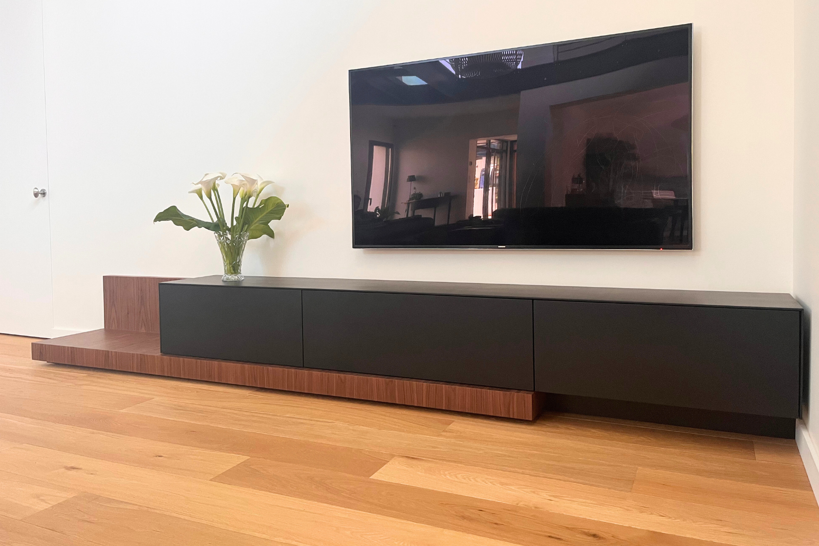 Dans une maison à Arcangues, Brotherwood a fabriqué un meuble TV sur mesure au design résolument contemporain, mêlant la chaleur du noyer et la sobriété du MDF laqué noir. L’ensemble, pensé comme un jeu d’équilibres, se compose de deux volumes superposés, dont l’un semble flotter au-dessus de l’autre dans un effet de légèreté maîtrisée.