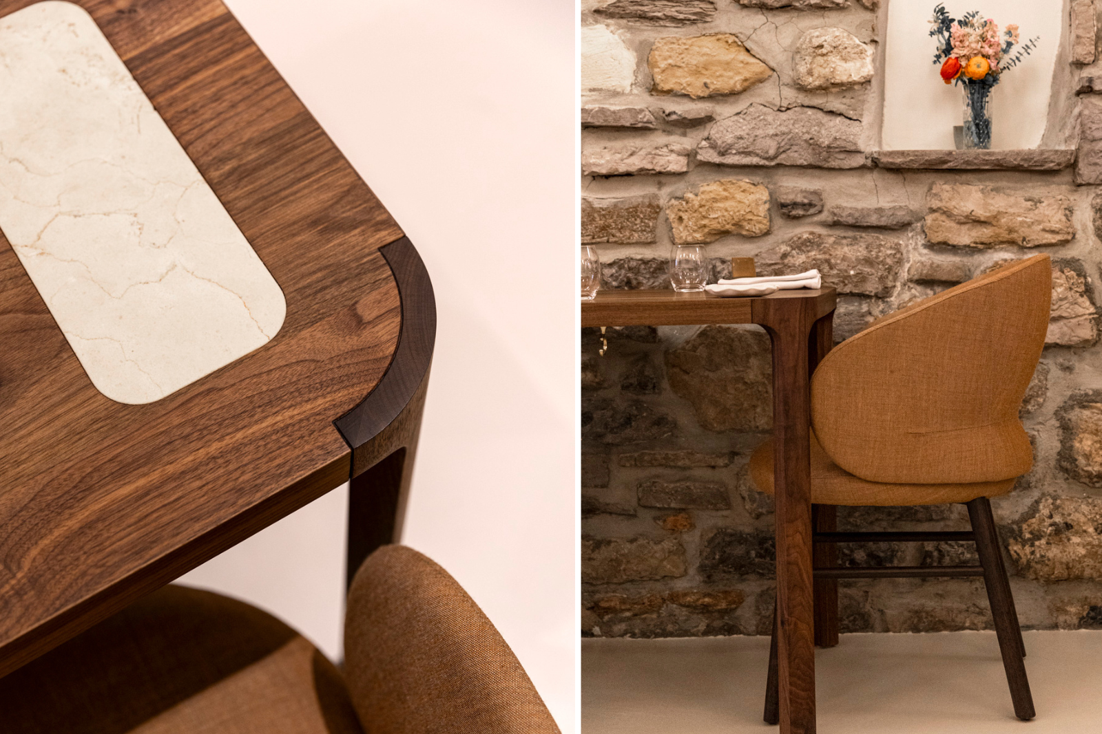 Nous avons conçu et fabriqué sur-mesure des tables à manger pour un restaurant gastronomique à Bayonne. Nous avons travaillé minutieusement sur chaque détail, mettant en œuvre un travail technique important, notamment sur les pieds et l’incrustation de pierre sur les plateaux. Cette table, réalisée en noyer massif, incarne l’élégance et la robustesse, parfaitement adaptées à l’ambiance raffinée du restaurant.