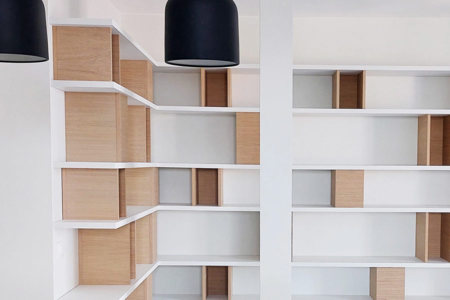Dans cette réalisation sur mesure, Brotherwood a conçu une bibliothèque d’angle qui allie la sobriété d’un MDF laqué blanc à la chaleur des cubes en chêne intégrés. Exploitant pleinement l’angle de la pièce, l’agencement occupe toute la hauteur du mur et transforme l’espace en un ensemble harmonieux et structurant. Les niches en chêne, contrastantes et soigneusement positionnées, créent un jeu graphique subtil tout en offrant des zones dédiées à l’exposition de livres et objets décoratifs. Leur insertion dans la surface blanche accentue la verticalité et la légèreté de la composition, apportant à la fois chaleur et modernité. Chaque détail a été pensé pour allier esthétique et fonctionnalité : l’équilibre des volumes, la précision des finitions et l’optimisation de l’angle témoignent du savoir-faire de Brotherwood. Cette bibliothèque d’angle ne se limite pas à un simple rangement, elle devient un véritable élément architectural qui structure la pièce tout en apportant caractère et élégance.