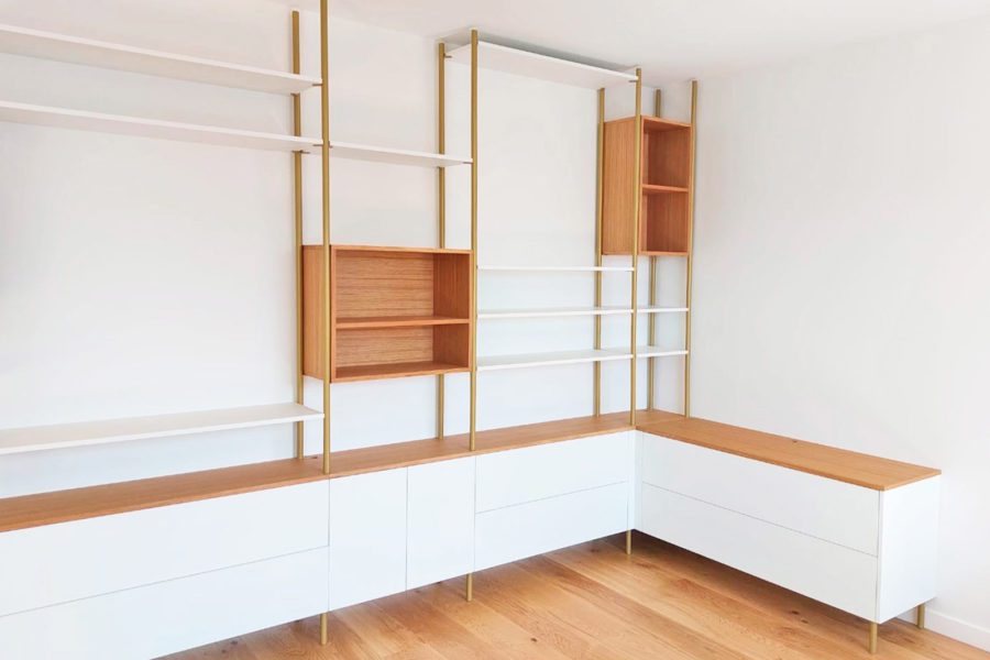 Bibliothèque sur-mesure en chêne, MDF laqué blanc et montants en métal thermolaqué laiton